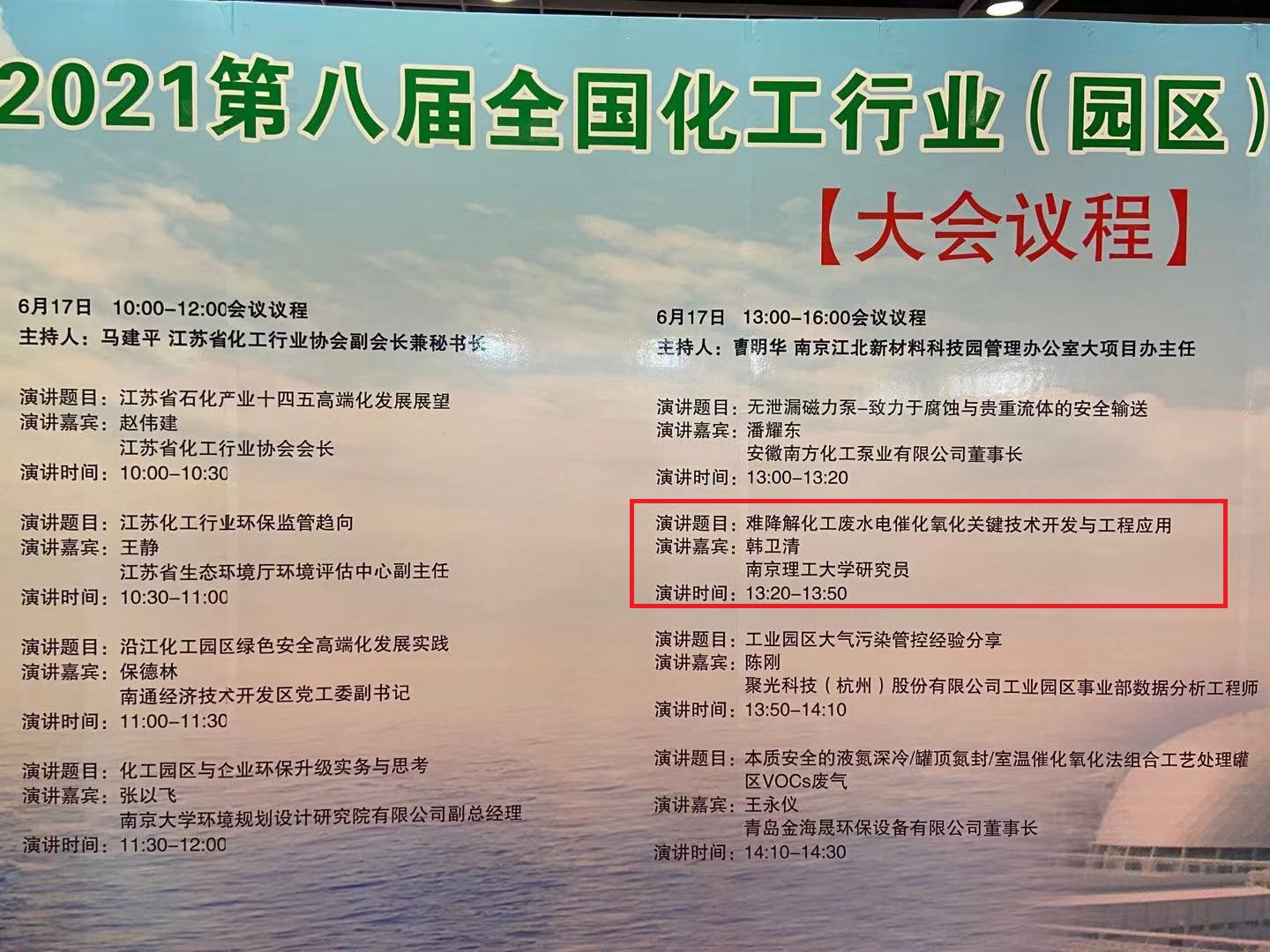 《2021年第八届全国化工行业(园区)污染综合治理大会》与2021年6月17日-2021年6月19日在南京国际博览中心举办,大会主题是“绿色安全、智能高效、高端创新,践行化工行业高质量发展之路”。我公司专家韩卫清教授受邀参加《2021年第八届全国化工行业(园区)污染综合治理大会》并做报告,我公司投资的南京市新型研发机构南京华工创新环境研究院有限公司参加展会进行宣传。