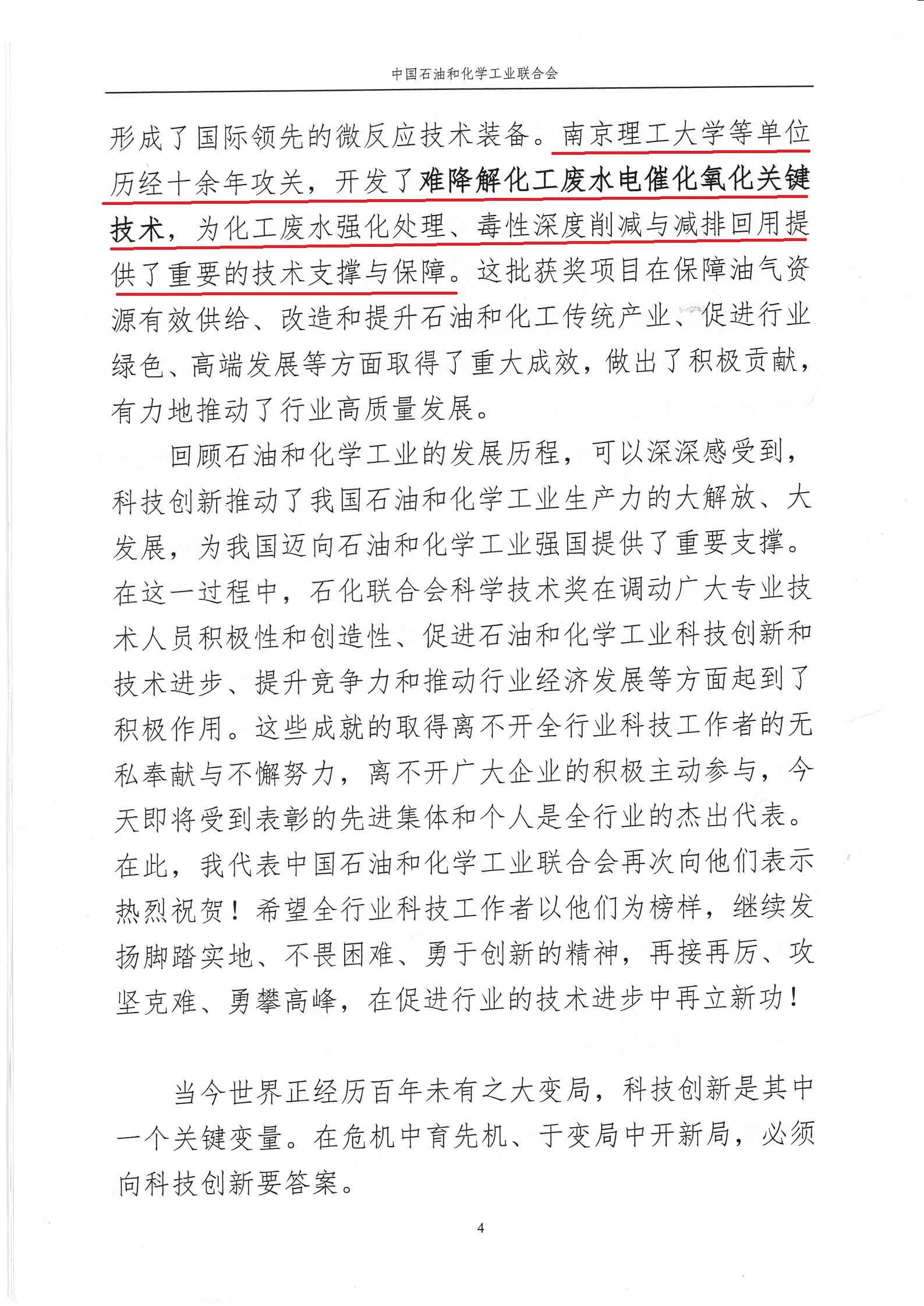 大会上,中国石油和化工联合会会长李寿生会长做讲话,介绍了南京理工大学等单位开发了难降解化工废水电化学氧化关键技术,为化工废水强化处理、毒性深度削减与减排回用提供了重要的技术支撑与保障。